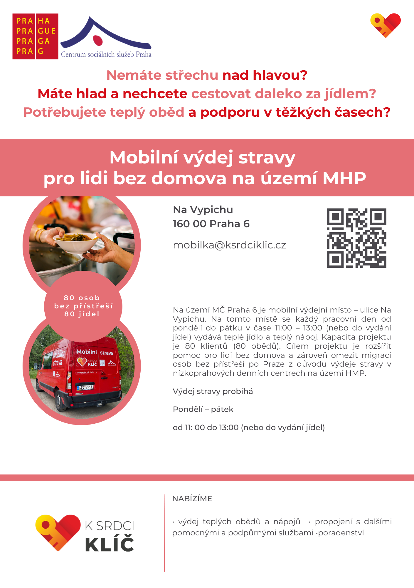 Na území MČ Praha 6 je mobilní výdejní místo – ulice Na Vypichu. Na tomto místě se každý pracovní den od pondělí do pátku v čase 11:00 – 13:00 (nebo do vydání jídel) vydává teplé jídlo a teplý nápoj. Kapacita projektu je 80 klientů (80 porcí). Cílem projektu je rozšířit pomoc pro lidi bez domova a zároveň omezit migraci osob bez přístřeší po Praze z důvodu výdeje stravy v nízkoprahových denních centrech na území HMP.